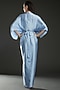 Featuring an ice blue draped kaftan dress in hammered satin base with rubber cording detail.