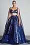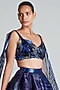 Featuring an ink blue layered lehenga in organza and tulle base with 3D beaded hand embroidery. It is paired with a matching blouse and a detachable metallic polymer drape.