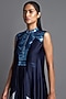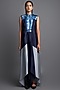 Featuring an ink blue metallic draped dress in chiffon base with a handwoven metallic polymer marbled yoke and panels.