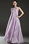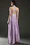 Featuring a lilac halter dress in striped fabric base with metallic polymer detailing. It is paired with a matching slip.