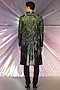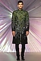 Featuring a black and green sherwani in silk base with moulded metallic polymer, cords, and glass beads hand embroidery. It is paired with a matching chanderi kurta and tapered pants.