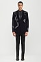 Featuring a black tuxedo in velvet base with glass beads detail. It is paired with a satin cotton shirt and velvet pants. Perfect attire for any cocktail party, sangeet or engagement ceremony, exuding traditional charm and timeless elegance.