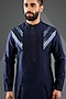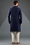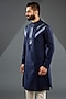 Featuring an ink blue kurta in chanderi silk and tussar silk cotton base with metallic chevron embroidery. Style it with pants and kolhapuri sandals for a royal and refined look, perfect for a festive occasion, family gathering or cultural events.