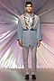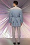 Featuring a pastel blue kimono jacket in striped fabric, satin crepe, and banana crepe base. It is paired with contrasting skinny pants and a belt.