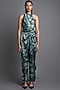 Featuring a mint asymmetrical marbled draped jumpsuit in chiffon base with an attached metallic tie-up.