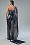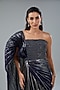 Featuring a navy blue and silver draped gown in metallic polymer and chiffon base. Accentuate with dangler earrings and heels for your wedding or reception ceremony.