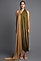 Featuring an olive and kathai colored asymmetrical draped dress in chiffon base with color blocking and metal pipe detailing.