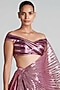 Featuring an onion pink lehenga in silk chanderi and tulle base with hand-embroidered dots. It is paired with a matching metallic polymer blouse and a drape.