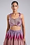 Featuring an oxblood skirt in butterfly net base with a metallic glitch detail. It is paired with a top and a dupatta. Accentuate it with zircon dangler earrings, a clutch and metallic heels for a cocktail, sangeet or evening soirees.