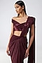 Featuring an oxblood pre-draped saree in chiffon base. It is paired with a blouse. Accentuate it with zircon jewellery, heels and a clutch for a sangeet or cocktail ceremony.