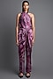 Featuring a pale plum asymmetrical marbled draped jumpsuit in chiffon base with an attached metallic tie-up.