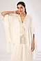 Amit Aggarwal presents a pearl white cape in crepe chiffon and metallic polymer base with an attached belt. It is paired with a slip. Style it with statement earrings, a necklace, and a clutch for a glamorous look.