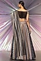 Featuring a pebble colored plisse lehenga in striped fabric and chevron fabric base. It is paired with a matching hand-embroidered metallic blouse and a structured drape.