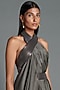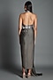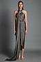 Featuring a pewter draped metallic dress in crinkled chiffon and nylon jersey base.