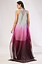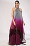 Amit Aggarwal presents a plum maxi dress in metallic polymer and crepe chiffon base. It is paired with a slip. Accentuate it with statement earrings and heels for evening wear or cocktail party.