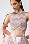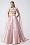 Featuring a rose gold lehenga in tulle base with metallic embroidery. It is paired with an embroidered halter blouse and a drape. Accentuate it with zircon or swarovski jewellery, embellished heels and a clutch for a bridal look, Perfect wear for your sangeet or cocktail ceremony.