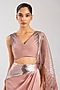 Featuring a rose skirt in satin chiffon base. It is paired with a blouse and a drape. Style this lehenga with zircon jewelry, block heels, and an embellished potli bag for an elegant festive occasions, wedding or engagement ceremony.