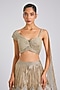 Featuring a sand-grey metallic fluted lehenga in tulle base with glass beads detail. It is paired with an organza metallic top and a metallic drape. Accentuate it with dangler earrings and heels for a cocktail evening, sangeet ceremony or reception night.