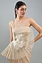 Featuring a sand gown in metallic polymer and crepe chiffon base. Accentuate it with minimal jewellery and heels for an evening wear or engagement ceremony.