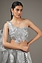Featuring a silver lehenga in metallic polymer base. It is paired with a blouse and drape. Accentuate it with statement jewellery and heels for a wedding or engagement ceremony.