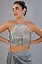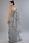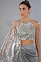 Featuring a silver lehenga in satin base. It is paired with a metallic polymer blouse and a detachable drape. Accentuate this statement lehenga set with heels and dangler earrings for a sangeet ceremony or cocktail.