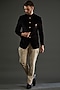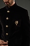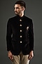 Featuring a black bandhgala in cotton velvet base with metal buttons and a metal brooch. It is paired with beige pants. Style it with pair of loafers and a bracelet for a wedding or sangeet ceremony.