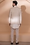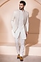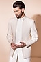 Featuring a cream indo western jacket in jacquard base with hand embroidery. It is paired with a contrasting silk long pleated waistcoat and trousers.