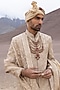 Featuring a gold sherwani in raw silk base with hand embroidery. It is paired with a twill modal kurta, pyjama pants and a georgette embroidered stole. A style rooted in tradition is perfect for weddings or engagement ceremonies, exuding regal charm.
