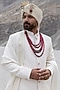 Featuring an ivory sherwani in poly crepe base with hand embroidery. It is paired with a twill modal kurta, pyjama pants and an organza stole. A style rooted in tradition is perfect for weddings or engagement ceremonies, exuding regal charm.