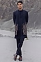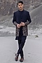 Featuring a navy blue front-open indowestern in poly knit base with floral hand embroidery. It is paired with a twill modal embroidered kurta and poly knit pants. Style it with mojaris for a festive occasion, wedding or engagement ceremony, exuding charm and elegance.