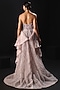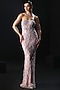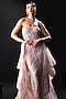 Featuring a pink pillar gown in tulle base with hand embroidery. It is paired with a matching trail. Accentuate with statement jewellery and heels for a bridal look.