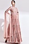 Featuring a pale peach high collar gown in georgette and soft net base with geometric and floral hand embroidery inlcuding long cape sleeves.