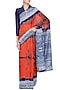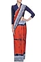 This set features a navy blue and orange handwoven saree in chanderi base with batik tye and dye print all over. It is paired with navy blue cotton silk cropped jacket style blouse with long sleeves.