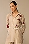 Featuring a beige shirt in cotton silk base with bloom details. It is paired with an inner, straight-leg trousers and a faux leather belt. Accentuate it with statement earrings and heels for a relaxed ensemble.