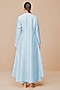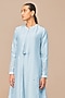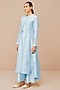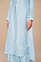 Featuring an ice blue jacket in chanderi base with cutwork and peacock motif embroidery. It is paired with an inner tunic, palazzo pants and a faux leather thin belt. Accentuate it with statement earrings and heels for summer brunch or casual outing.