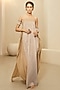Featuring a taupe off-shoulder maxi dress in cotton voile base with an attached rexine belt.