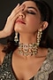 Featuring a gold finish choker necklace studded with multi-colored kundan polki, set in brass. It is paired with a matching pair of earrings. Perfect for festive occasions or wedding ceremonies.