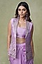 Featuring a lilac sharply-cut jacket in modal satin and raw silk base with floral and mirror embroidery. It is paired with a structured bustier and a dhoti-style draped skirt. Accentuate it with statement earrings and heels for sangeet, cocktail or pre-wedding ceremonies.
