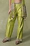 Featuring a lime green asymmetrical overlay jacket in organza and raw silk base with mirror work. It is paired with a square-neck bustier and wide-leg pants. Accentuate it with statement earrings and heels for sangeet, mehendi or pre-wedding ceremonies.