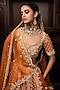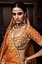 Featuring a mustard lehenga in raw silk and organza base with zari, sequins cutdana and zardosi embroidery. It is paired with an embroidered blouse having a sweetheart neckline and two dupattas. Style it with diamond and emerald layered necklaces and a sleek bun, great for a sophisticated and luxurious bridal ensemble.