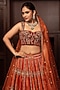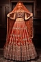 Featuring an orange lehenga in velvet and organza base with sequins cutdana and zardosi embroidery. It is paired with a red embroidered corset-style blouse and a dupatta. Style it with diamond and emerald layered necklaces and a sleek bun, great for a sophisticated and luxurious bridal ensemble.