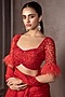 Featuring a rose red saree in organza base with feather work and cutdana embroidery. It is paired with a blouse and an underskirt. Accentuate it with statement jewellery and heels for a festive occasion.