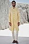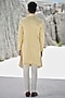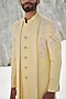 Featuring a bright yellow cape indowestern in modal silk base with floral beaded embroidery. It is paired with ivory cotton silk pants. Style it up with mojaris for a wedding, sangeet or engagement ceremony.