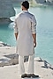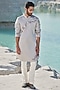 Featuring a pearl grey kurta in modal silk base with french knot and beads hand embroidery. It is paired with ivory cotton silk trousers. Style it up with kolhapuri sandals for a festive occasion, an intimate pooja, wedding or engagement ceremony.
