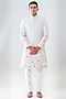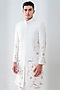 Featuring a mint green sherwani in raw silk base with embellishments. It is paired with a self chanderi kurta and ivory trousers. Perfect wear for a wedding or engagement ceremony.