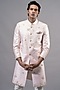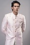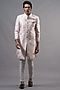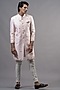 Featuring a rose gold sherwani in raw silk base with zardosi, resham and glass beaded hand embellishments. It is paired with a matching kurta and pants.
