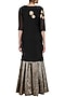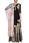 This set features a black short kurta in chanderi base with gold tissue floral embroidery on the front yoke and side bottom. It is paired with black brocade sharara pants. It comes along with blush net dupatta with gota lace border at the edges.
