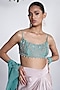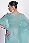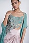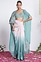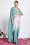 Featuring a teal cape in sheer organza base with cutwork embellishments. It is paired with a matka blouse and a teal and white satin skirt. Accentuate it with silver jewellery and heels for a festive celebrations, wedding functions or evening soirees.