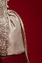 Featuring a champagne bucket bag bag in organza tissue base with woven silver lace and zari thread tassel detailing. It has a poly satin lining and a hand embroidered handle. Whether you're dressing up for a special occasion or adding a dash of elegance to your traditional look, it is an ideal accessory to complete your ensemble.