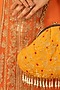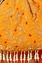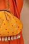 Featuring an orange handcrafted bandhani purse in pure banarasi silk base with braided gold metal chain embellishment, pearl and cutdana fringe detail. It has a beige suede lining. Carry it as a statement piece with an evening gown or traditional attire for weddings, formal events, gala nights, or festive celebrations.